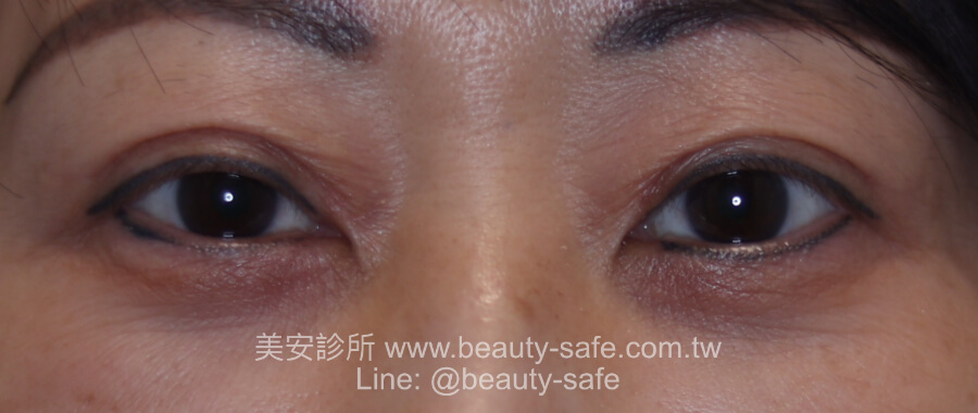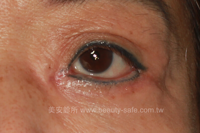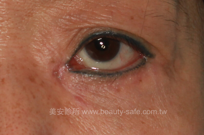 年輕的職業婦女因為蠟燭兩頭燒,所以眼皮老化的比較快,尤其外眼角下垂的很厲害。現在孩子長大些,終於可以對自己好一些了。這種老化性雙眼皮與年輕形雙眼皮手術最大不同是必須割到眼角外側將冗余的眼皮切除,所以術後眼角外側有一小段疤痕,必須貼美容膠1~3個月。如果有好好照顧之後這條疤痕是幾乎看不到的。這位輕熟女術後一個月眼睛已經恢復昔日的風采了